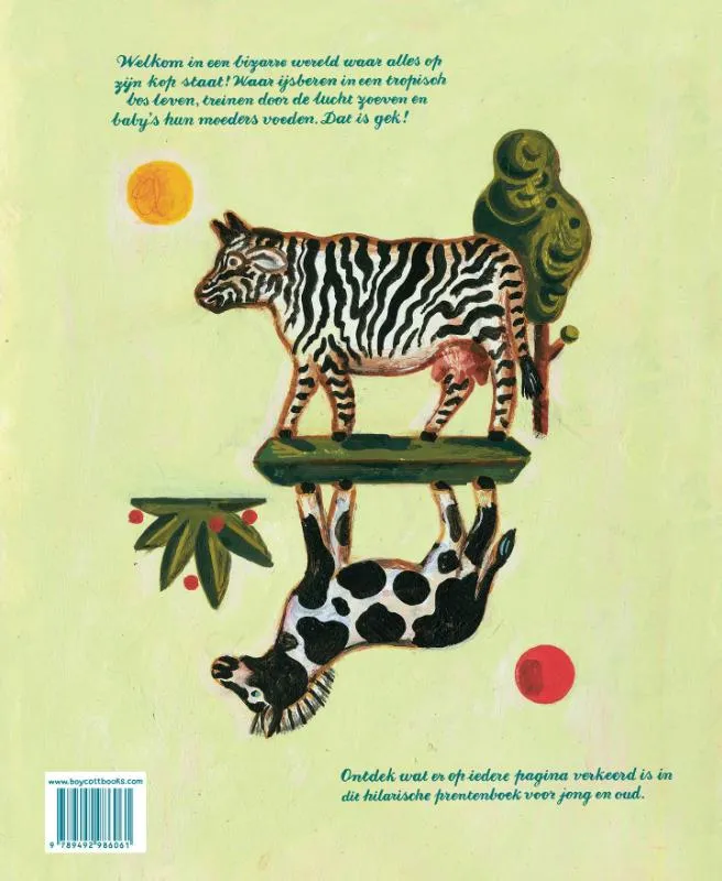 Welkom in een bizarre wereld waar alles op z’n kop staat! Waar treinen door de lucht zoeven en baby’s hun moeders voeden. Ontdek wat er op iedere pagina verkeerd is in dit hilarische prentenboek.