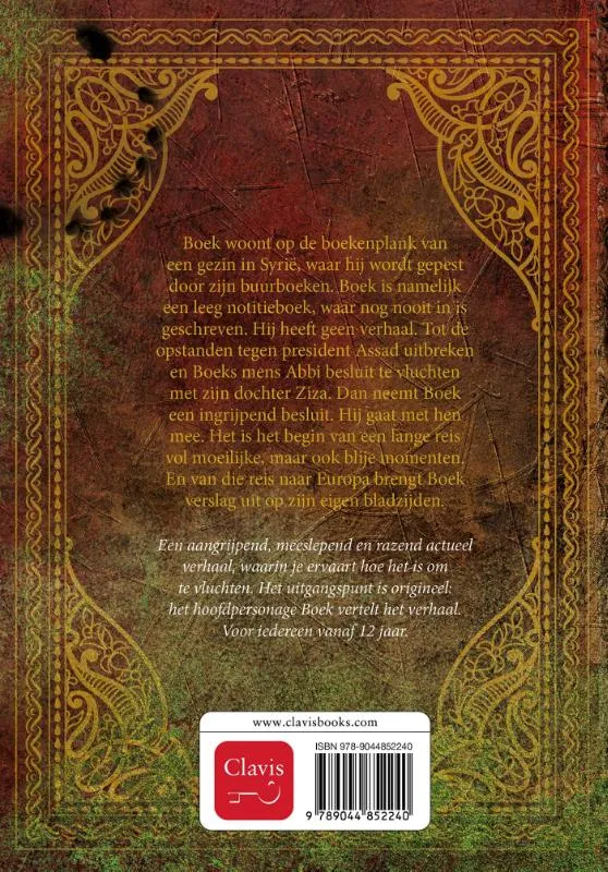 Boek woont op de boekenplank van een gezin in Syrië, waar hij wordt gepest door zijn buurboeken. Boek is namelijk een leeg notitieboek, waar nog nooit in is geschreven. Hij heeft geen verhaal. Tot de opstanden tegen president Assad uitbreken en Boeks mens Abbi besluit te vluchten met zijn dochter Ziza. Dan neemt Boek een ingrijpend besluit. Hij gaat met hen mee. Het is het begin van een lange reis vol moeilijke, maar ook blije momenten. En van die reis naar Europa brengt Boek verslag uit op zijn eigen bladzijden.