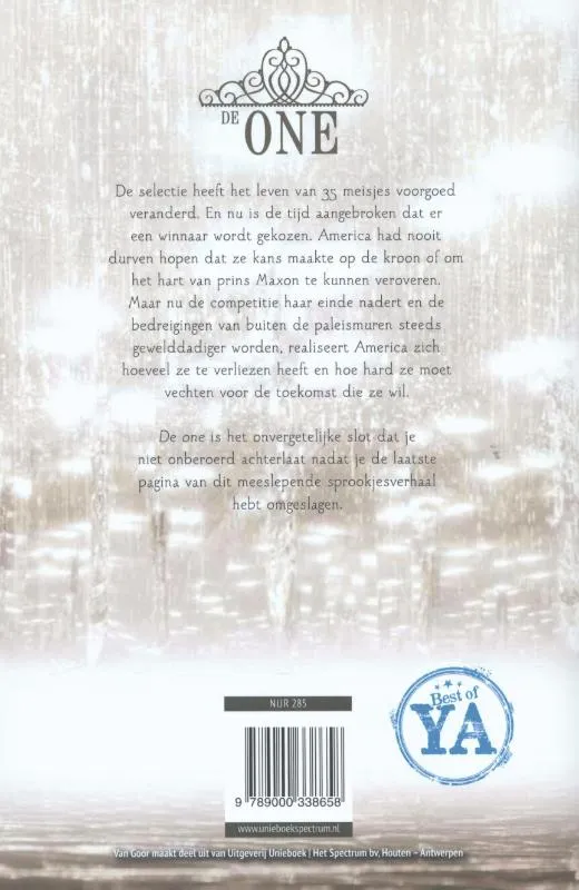 De selectie heeft het leven van 35 meisjes voorgoed veranderd. En nu is de tijd aangebroken dat er een winnaar wordt gekozen. America had nooit durven hopen dat ze kans maakte op de kroon of om het hart van prins Maxon te kunnen veroveren. Maar nu de competitie haar einde nadert en de bedreigingen van buiten de paleismuren steeds gewelddadiger worden, realiseert America zich hoeveel ze heeft te verliezen en hoe hard ze moet vechten voor de toekomst die ze wil.