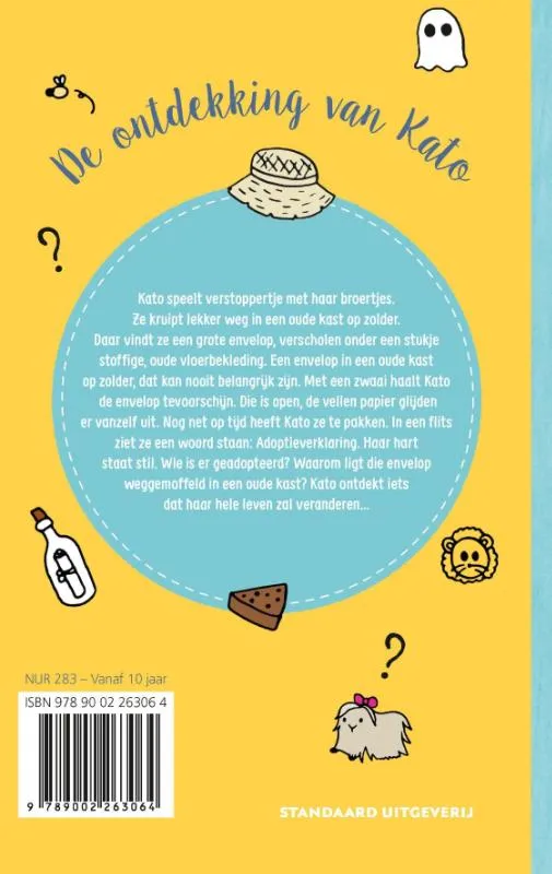 Kato speelt verstoppertje met haar broertjes. Ze kruipt lekker weg in een oude kast op zolder. Daar vindt ze een grote envelop, verscholen onder een stukje stoffige, oude vloerbekleding. Een envelop in een oude kast op zolder, dat kan nooit belangrijk zijn. Met een zwaai haalt Kato de envelop tevoorschijn. Die is open, de vellen papier glijden er vanzelf uit. Nog net op tijd heeft Kato ze te pakken. In een flits ziet ze een woord staan: Adoptieverklaring. Haar hart staat stil. Wie is er geadopteerd? Waarom ligt die envelop weggemoffeld in een oude kast? Kato ontdekt iets dat haar hele leven zal veranderen.