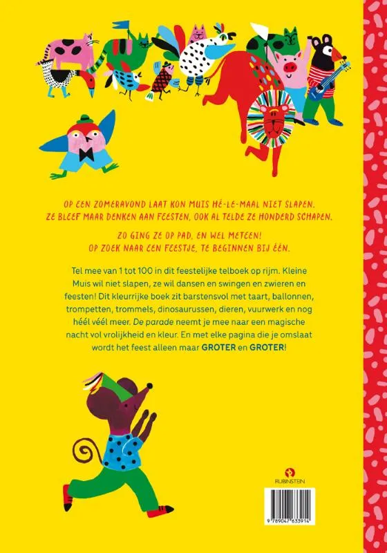Tel mee van 1 tot 100 in dit feestelijke telboek op rijm. Kleine Muis wil niet slapen, ze wil dansen en swingen en zwieren en feesten! Dit kleurrijke boek zit barstensvol met taart, ballonnen, trompetten, trommels, dinosaurussen, dieren, vuurwerk en nog héél véél meer. De parade neemt je mee naar een magische nacht vol vrolijkheid en kleur. En met elke pagina die je omslaat wordt het feest alleen maar GROTER en GROTER!