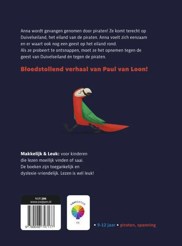 In dit spannende boek probeert Anna te ontsnappen aan piraten én de geest van Duivelseiland. Zal het haar lukken? Het is op AVI E5 en voor kinderen van 9-12 jaar. De serie ‘Makkelijk & Leuk’ is speciaal voor kinderen die lezen moeilijk vinden of saai. Zo krijgen zij weer plezier in lezen. Dyslexievriendelijk!<br><br>Anna wordt gevangen genomen door piraten! Ze komt terecht op Duivelseiland, het eiland van de piraten.<br>Anna voelt zich eenzaam en er waart ook nog een geest op het eiland rond.<br>Als ze probeert te ontsnappen, moet ze het opnemen tegen de geest van Duivelseiland én tegen de piraten.