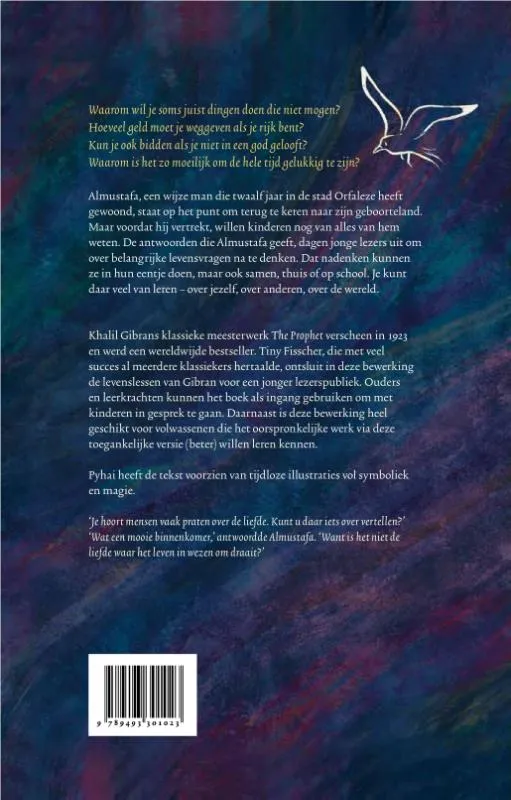 Almustafa, een wijze man die twaalf jaar in de verzonnen stad Orfaleze heeft gewoond, staat op het punt om terug te keren naar zijn geboorteland. Maar voordat hij vertrekt, willen kinderen nog van alles van hem willen weten. De antwoorden die Almustafa geeft, dagen jonge lezers uit om over belangrijke levensvragen na te denken. Dat nadenken kunnen ze in hun eentje doen, maar ook samen, thuis of op school. Er samen over praten is al helemaal mooi. Je kunt daar veel van leren – over jezelf, over anderen, over de wereld.