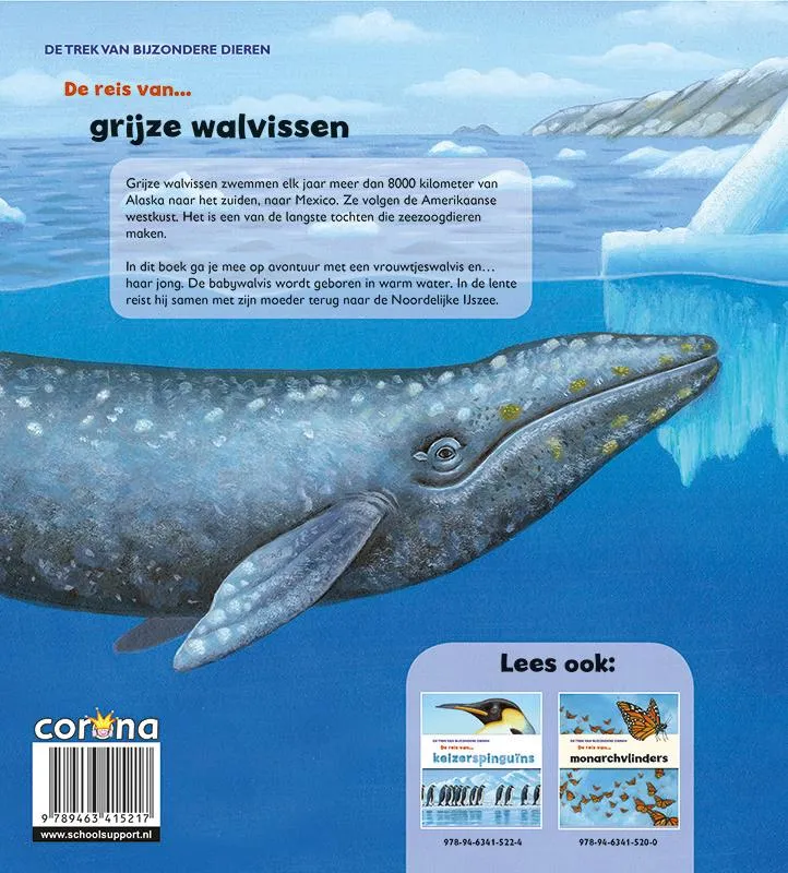 In dit boek ga je mee op avontuur met een vrouwtjeswalvis en… haar jong. De babywalvis wordt geboren in warm water. In de lente reist hij samen met zijn moeder terug naar de Noordelijke IJszee.