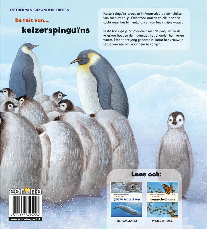 Keizerspinguïns broeden in Antarctica op een vlakte van sneeuw en ijs. Daarvoor maken ze elk jaar een tocht naar het binnenland, ver van het visrijke water. In dit boek ga je op avontuur met de pinguïns. In de vrieskou houden de mannetjes het ei onder hun veren warm. Nadat het jong geboren is, komt het vrouwtje terug van zee om voor hem te zorgen.