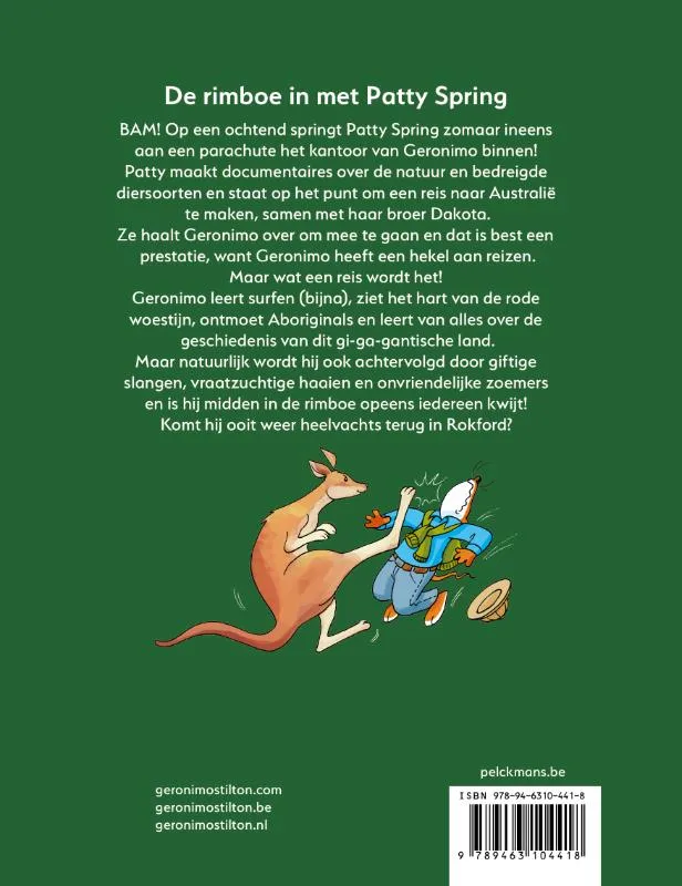 BAM! Op een ochtend springt Patty Spring zomaar ineens aan een parachute het kantoor van Geronimo binnen! Patty maakt documentaires over de natuur en bedreigde diersoorten en staat op het punt om een reis naar Australië te maken, samen met haar broer Dakota. Ze haalt Geronimo over om mee te gaan en dat is best een prestatie, want Geronimo heeft een hekel aan reizen. Maar wat een reis wordt het! Geronimo leert surfen (bijna), ziet het hart van de rode woestijn, ontmoet Aboriginals en leert van alles over de geschiedenis van dit gi-ga-gantische land. Maar natuurlijk wordt hij ook achtervolgd door giftige slangen, vraatzuchtige haaien en onvriendelijke zoemers en is hij midden in de rimboe opeens iedereen kwijt! Komt hij ooit weer heelvachts terug in Rokford?