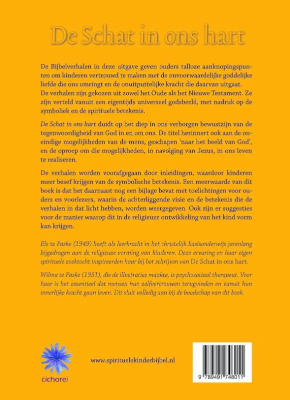 De Bijbelverhalen in deze uitgave geven ouders talloze aanknopingspunten om kinderen vertrouwd te maken met de onvoorwaardelijke goddelijke liefde die ons omringt en de onuitputtelijke kracht die daarvan uitgaat.De verhalen zijn gekozen uit zowel het Oude als het Nieuwe Testament. Ze zijn verteld vanuit een eigentijds universeel godsbeeld, met nadruk op de symboliek en de spirituele betekenis.De Schat in ons hart duidt op het diep in ons verborgen bewustzijn van de tegenwoordigheid van God in en om ons. De titel herinnert ook aan de oneindige mogelijkheden van de mens, geschapen ‘naar het beeld van God’, en de oproep om die mogelijkheden, in navolging van Jezus, in ons leven te realiseren. De verhalen worden voorafgegaan door inleidingen, waardoor kinderen meer besef krijgen van de symbolische betekenis. Een meerwaarde van dit boek is dat het daarnaast nog een bijlage bevat met toelichtingen voor ouders en voorlezers, waarin de achterliggende visie en de betekenis die de verhalen in dat licht hebben, worden weergegeven. Ook zijn er suggesties voor de manier waarop dit in de religieuze ontwikkeling van het kind vorm kan krijgen.Els te Paske (1949) heeft als leerkracht in het christelijk basisonderwijs jarenlang bijgedragen aan de religieuze vorming van kinderen. Deze ervaring en haar eigen spirituele zoektocht inspireerden haar bij het schrijven van De Schat in ons hart.Wilma te Paske (1951), die de illustraties maakte, is psychosociaal therapeut. Voor haar is het essentieel dat mensen hun zelfvertrouwen terugvinden en vanuit hun innerlijke kracht gaan leven. Dit sluit volledig aan bij de boodschap van dit boek.