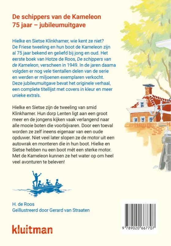 Hielke en Sietse Klinkhamer, wie kent ze niet? De Friese tweeling en hun boot de Kameleon zijn al 75 jaar bekend en geliefd bij jong en oud. Het eerste boek van Hotze de Roos, De schippers van de Kameleon, verscheen in 1949. In de jaren daarna volgden er nog vele tientallen delen van de serie en werden er miljoenen exemplaren verkocht. Deze jubileumuitgave bevat het originele verhaal, een complete titellijst met covers in kleur en meer unieke extra’s.
