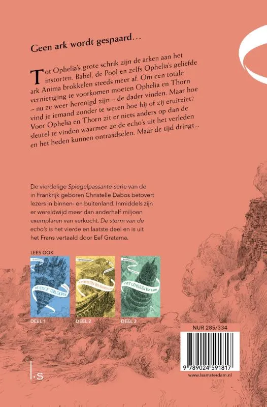 De storm van de echo’s is het vierde en laatste deel uit de betoverende Spiegelpassante-serie van Christelle Dabos. Tot Ophelia’s grote schrik zijn de arken aan het instorten. Geen ark wordt gespaard. Babel, de Pool en zelfs Ophelia’s geliefde Anima zijn verwoest.