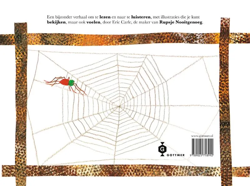 Op een mooie morgen wordt een spin door een zacht briesje door de lucht gedragen. Een ragfijne draad sliert achter haar aan. Ze landt op een hek bij een boerderij en begint een web te weven. Een web dat je echt vóélt groeien als je met je vingers over de bladzijden gaat!