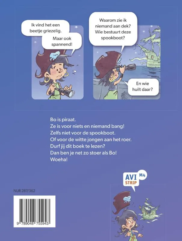 Bo is piraat.<br>Ze is voor niets en niemand bang!<br>Zelfs niet voor de spookboot.<br>Of voor de witte jongen aan het roer.<br>Durf jij dit boek te lezen?<br>Dan ben je net zo stoer als Bo!<br>Woeha!<br><br>Op zoek naar avontuur? Vaar mee op zee met piraat Bo. Ze komt een spannende spookboot tegen met aan boord een spierwitte jongen. Is hij een spook? De andere piraten zijn ineens verdwenen … <br><br>Wil jij weten wat er aan de hand is? In deze avontuurlijke AVI Strip op AVI M4-niveau voor kinderen van 6 tot 8 jaar kom je erachter. Deze strip is getekend door Daniel van der Broek en Robbert Damen schreef het spannende en grappige verhaal. <br><br>Leesniveau: AVI M4