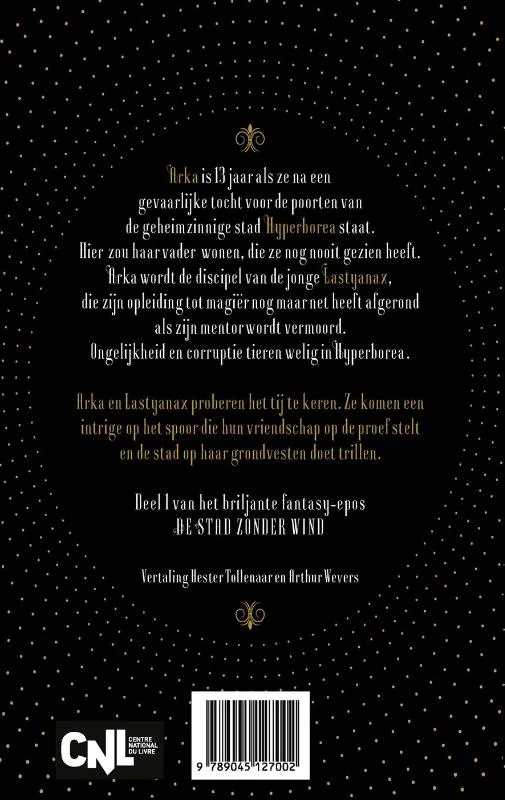 Extra spannende pageturner<br><br>Arka is nog maar 13 jaar als ze na een gevaarlijke tocht voor de poorten van de geheimzinnige stad Hyperborea staat. Hier zou haar vader wonen, die ze nog nooit gezien heeft. Arka wordt de discipel van de jonge Lastyanax, die zijn opleiding tot magiër nog maar net heeft afgerond. Als zijn mentor vermoord wordt, wordt Lastyanax meteen het politieke leven in gekatapulteerd. Ongelijkheid en corruptie tieren welig in Hyperborea. Het duo (Arka de rebelse strijdster, Lastyanax de intellectuele activist) probeert het tij te keren. Ze komen een intrige op het spoor die hun vriendschap op de proef stelt en de stad op haar grondvesten doet trillen.<br><br>Wordt vergeleken met de succesvolle serie De spiegelpassante en met boeken van Philip Pullman<br><br>Een wonderbaarlijk verhaal dat fantasy combineert met het spannende genre. Adembenemend en meeslepend – Lislysworld.fr<br><br>Zo’n magisch, spannend, bedwelmdend debuut hebben we sinds Harry Potter en de Steen der Wijzen niet meer gelezen! Spektakel, vanaf de eerste bladzijde. Wat een meesterwerk!<br><br>literaturmarkt.info