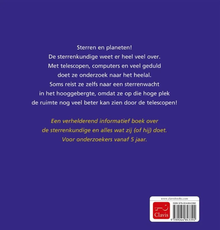 Sterren en planeten! De sterrenkundige weet er heel veel over. Met telescopen, computers en veel geduld doet ze onderzoek naar het heelal. Soms reist ze zelfs naar een sterrenwacht in het hooggebergte, omdat ze op die hoge plek de ruimte nog veel beter kan zien door de telescopen!