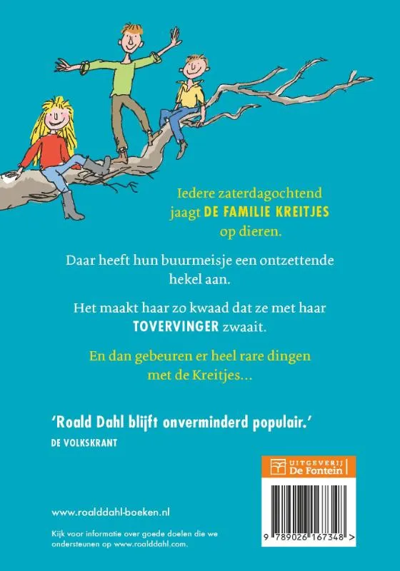 De tovervinger is een fantastisch kinderboek van bestsellerauteur Roald Dahl. Met prachtige tekeningen van bekroond illustrator Quentin Blake.<br><br>Meneer Kreitjes en zijn zonen jagen op eenden. Daar heeft hun buurmeisje een ontzettende hekel aan. Zij probeert hun duidelijk te maken dat ze echt moeten ophouden, maar ze wordt gewoon uitgelachen. Dan doet ze het enige wat ze nog kan doen: ze zwaait met haar tovervinger!<br><br>Wanneer de Kreitjes de volgende morgen wakker worden, zijn hun armen in vleugels veranderd. En dat is nog niet alles. Vier grote wilde eenden pikken hun huis in, en de Kreitjes merken dat zíj niet langer de jagers zijn, maar dat er op hén wordt gejaagd.<br><br>‘Roald Dahl is de beste kinderboekenschrijver ter wereld.’ VPRO-gids