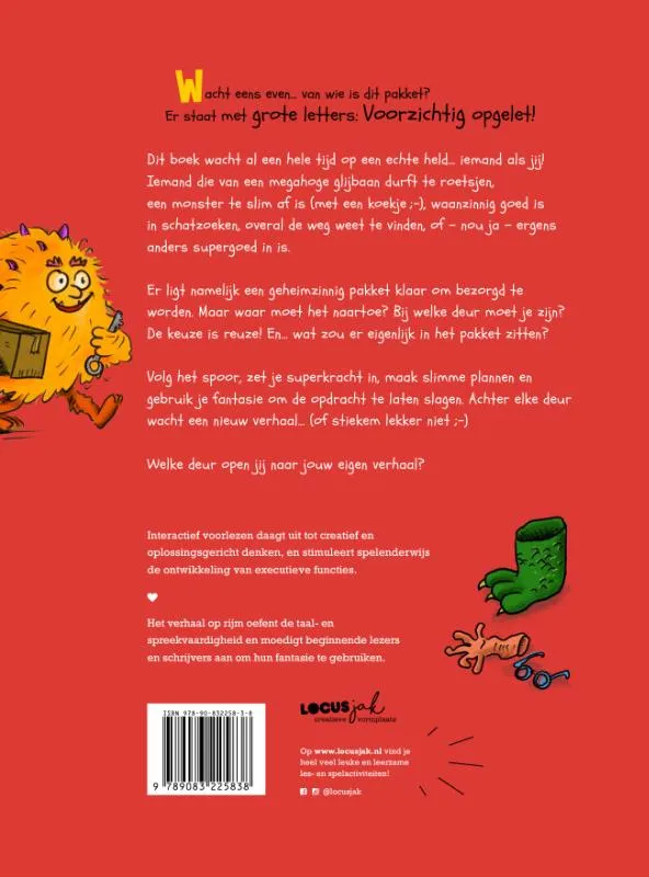 Wacht eens even… van wie is dit pakket? Er staat met grote letters: voorzichtig opgelet!Dit boek wacht al een hele tijd op een echte held… iemand zoals jij! Iemand die van een megahoge glijbaan durft te roetsjen, een monster te slim af is (met een koekje), waanzinnig goed is in schatzoeken, de weg weet te vinden, of – nou ja – ergens anders supergoed in is.Er ligt namelijk een geheimzinnig pakket klaar om bezorgd te worden. Maar waar moet het naartoe? Bij welke deur moet je zijn? De keuze is reuze! En… wat zou er eigenlijk in het pakket zitten?Volg het spoor, zet je superkracht in, maak slimme plannen en gebruik je fantasie om jouw opdracht te laten slagen. Achter elke deur wacht een nieuw verhaal… (Of stiekem lekker niet)Welke deur open jij naar je eigen verhaal?——Spel – en lesmateriaal met executieve functiesOok bij dit prentenboek wordt een groot pakket aan leuke en leerzame spel- en lesactiviteiten ontwikkeld. Het interactief voorlezen daagt uit tot creatief en oplossingsgericht denken, en stimuleert spelenderwijs de ontwikkeling van executieve functies. Het verhaal op rijm oefent de taal- en spreekvaardigheid en moedigt beginnende lezers en schrijvers aan om hun fantasie te gebruiken.