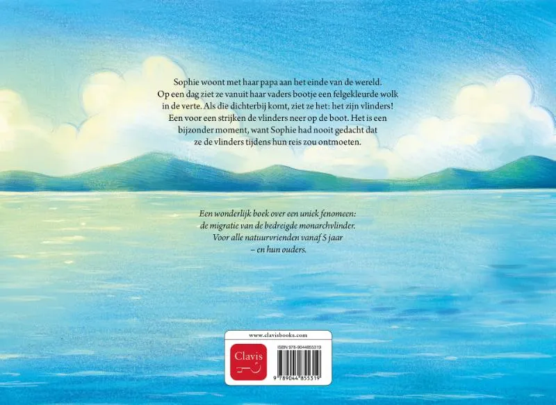 Sophie woont met haar papa aan het einde van de wereld. Op een dag ziet ze vanuit haar vaders bootje een felgekleurde wolk in de verte. Als die dichterbij komt, ziet ze het: het zijn vlinders! Een voor een strijken de vlinders neer op de boot. Het is een bijzonder moment, want de vlinders hebben al een heel lange weg afgelegd voor ze bij Sophie en de boot terechtkomen.