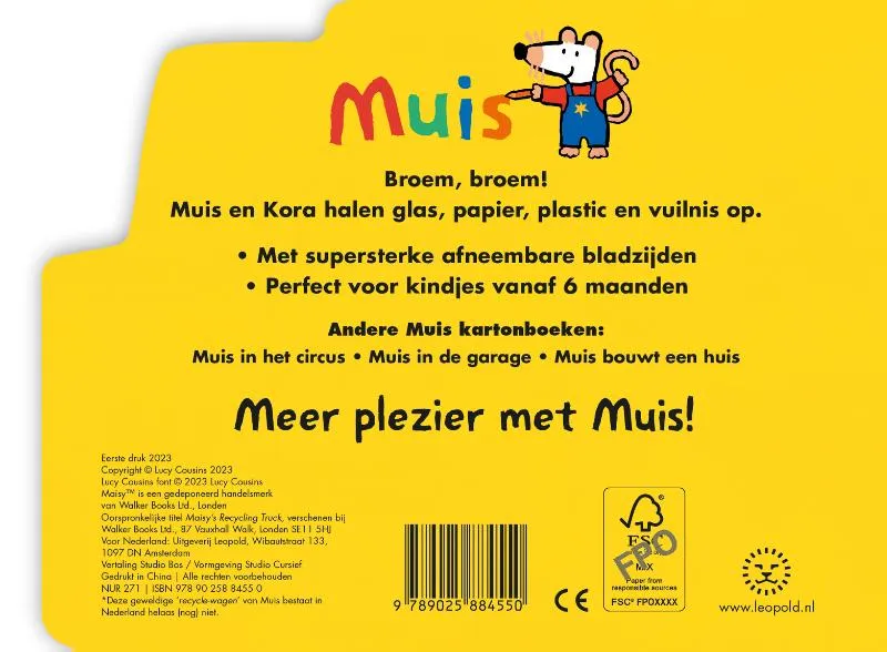 Stevig kartonboek van Muis in de vorm van een vuilniswagen. Perfect voor kindjes van 6 maanden.