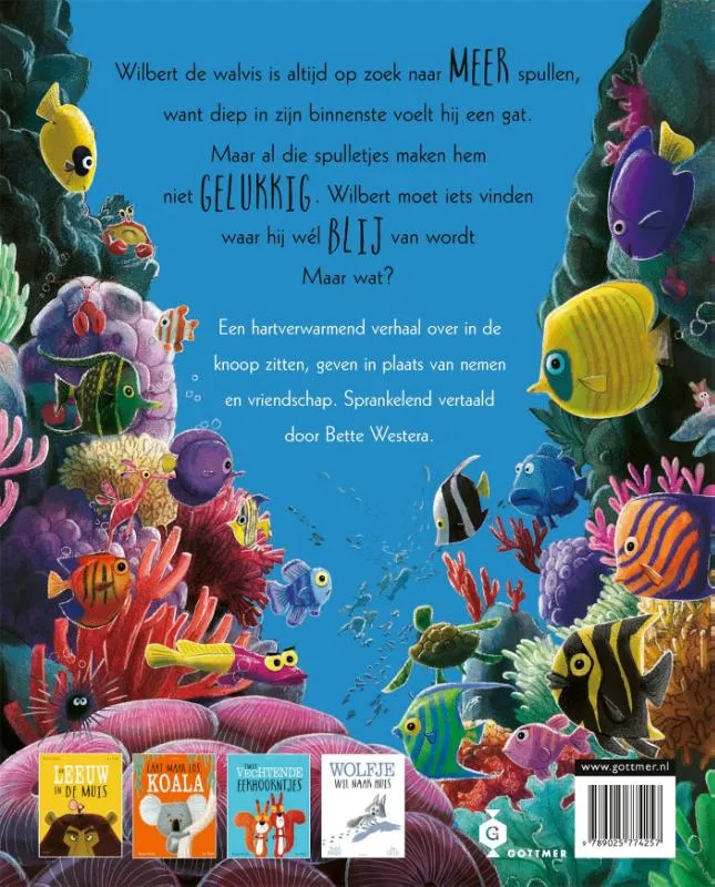 Diep, diep in de zee woont een walvis. Hij wordt elke ochtend wakker met een knagend gevoel in zijn buik. Het is net alsof er een groot gat zit. Hij heeft geen honger. Maar wat mist er dan? Om de leegte te vullen, gaat hij op zoek naar spullen. De mooiste schatten uit de diepzee, bijzondere dingen uit scheepswrakken. Op een dag ziet hij een mooi koraalrif. Zal hij daar vinden wat hij zoekt? Maar dan zet een dappere kleine krab hem aan het denken. Misschien kan hij het gat niet vullen met spullen verzamelen, maar juist door iets aan een ander te geven. Rachel Bright en Jim Field zijn het duo achter prentenboeken als ‘Twee vechtende eekhoorntjes’, ‘De leeuw in de muis’ en ‘Laat maar los, Koala.’ Al hun prentenboek zijn prachtig om te zien, heerlijk op rijm en bevatten een wijze les.