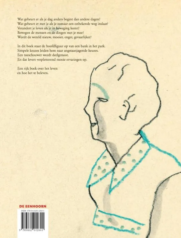 Wat gebeurt er als je dag anders begint dan andere dagen? Wat gebeurt er met je als je zomaar een onbekende weg inslaat? In dit boek staat de hoofdfiguur op van een bank in het park. Simpele keuzes leiden hem naar angstaanjagende keuzes. Een toeschouwer wordt deelgenoot. En dat levert verpletterend mooie ervaringen op.