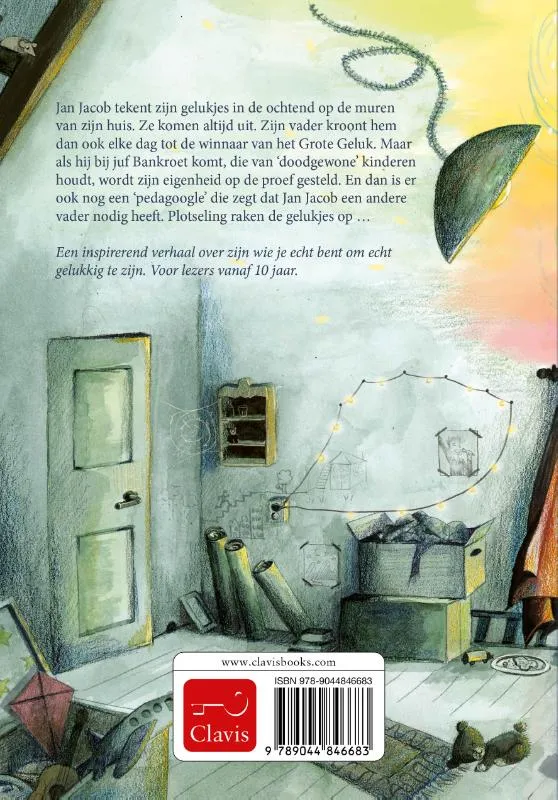 Jan Jacob tekent zijn gelukjes in de ochtend op de muren van zijn huis. Ze komen altijd uit. Zijn vader kroont hem