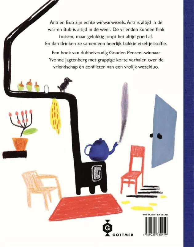 Arti en Bub zijn de wirwarwezels! Het dikke voorleesboek ‘De wirwarwezels’ van tweevoudig Gouden Penseel-winnares Yvonne Jagtenberg zit vol met grappige verhalen over de twee vrienden. Arti is altijd in de war en Bub is altijd in de weer. Gelukkig lopen alle avonturen meestal goed af, met een lekker bakkie troost: eikeltjeskoffie!<br><br>’De wirwarwezels’ is een heerlijk eigenzinnig en droogkomisch voorleesboek – een boek zoals alleen Yvonne Jagtenberg dat kan maken. Met haar gevoel voor humor en haar rake illustraties slaagt Jagtenberg erin complexe thema’s op een toegankelijke manier aan te snijden. ‘De wirwarwezels’ is leuk om voor te lezen aan kinderen vanaf 4 jaar.<br><br>Lees ook Yvonne Jagtenbergs prentenboeken ‘Ik ben Pippi niet! ‘ (Bronzen Penseel), ‘Hup Herman! ‘ (Gouden Penseel) en ‘Kop op, Herman! ‘ of de serie kartonboekjes over Klein Geitje voor de allerkleinsten.