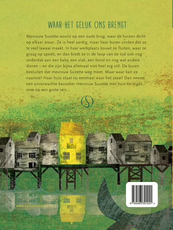 Mevrouw Suzette woont op een oude brug, waar de huizen dicht op elkaar staan. Ze is heel aardig, maar haar buren vinden dat ze te veel lawaai maakt. In haar werkplaats bouwt ze fluiten, waar ze graag op speelt, en dan biedt ze in de loop van de tijd ook nog onderdak aan een baby, een slang, een hond en nog wat andere dieren – en die zijn bijna allemaal niet heel erg stil. De buren besluiten dat mevrouw Suzette weg moet. Maar waar kan ze naartoe? Haar huis staat nu eenmaal waar het staat! Dan neemt een onverwachte bezoeker mevrouw Suzette met huis én logees mee op een grote reis…