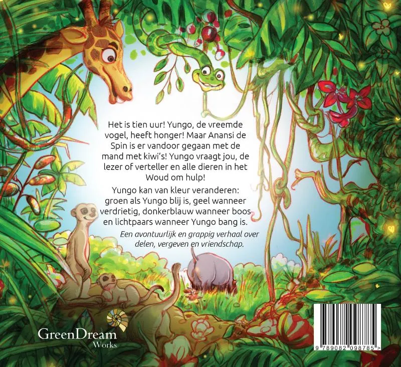 Het is tien uur! Yungo, de vreemde vogel, heeft honger! Maar Anansi de Spin is er vandoor gegaan met de mand met kiwi’s! Yungo vraagt jou, de lezer of verteller en alle dieren in het Woud om hulp!
