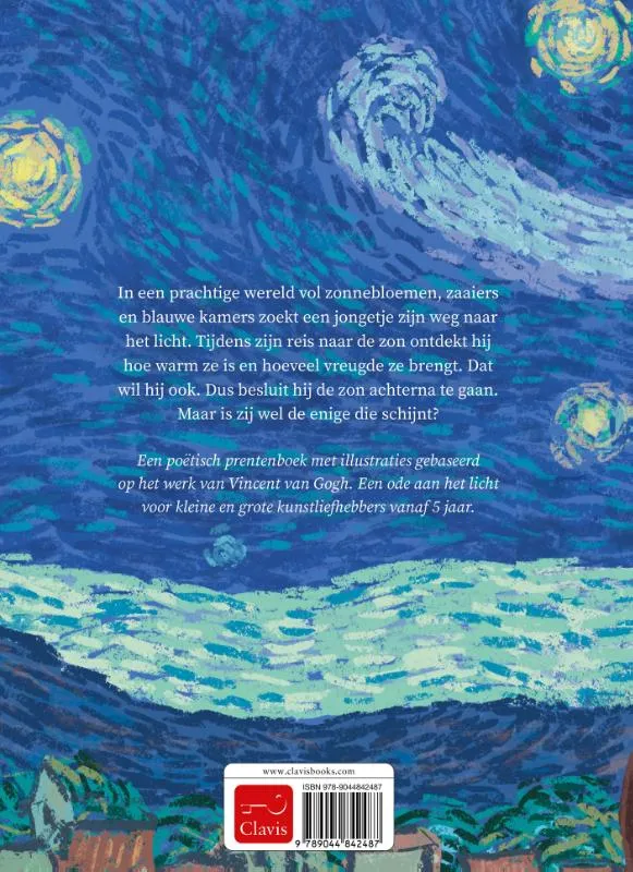 In een prachtige wereld vol zonnebloemen, zaaiers en blauwe kamers zoekt een jongetje zijn weg naar het licht. Tijdens zijn reis naar de zon ontdekt hij hoe warm ze is en hoeveel vreugde ze brengt. Dat wil hij ook. Dus besluit hij de zon achterna te gaan. Maar is zij wel de enige die schijnt? Een poëtisch prentenboek met illustraties gebaseerd op het werk van Vincent van Gogh. Een ode aan het licht voor kleine en grote kunstliefhebbers vanaf 5 jaar.