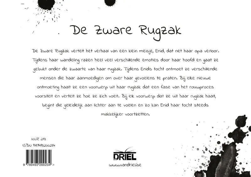 De zware rugzak vertelt het verhaal van een klein meisje, Enid, dat net haar opa verloor. Tijdens een wandeling razen heel veel verschillende emoties door haar hoofd en gaat ze gebukt onder de zwaarte van haar rugzak. Zal Enids rugzak ooit weer lichter worden?