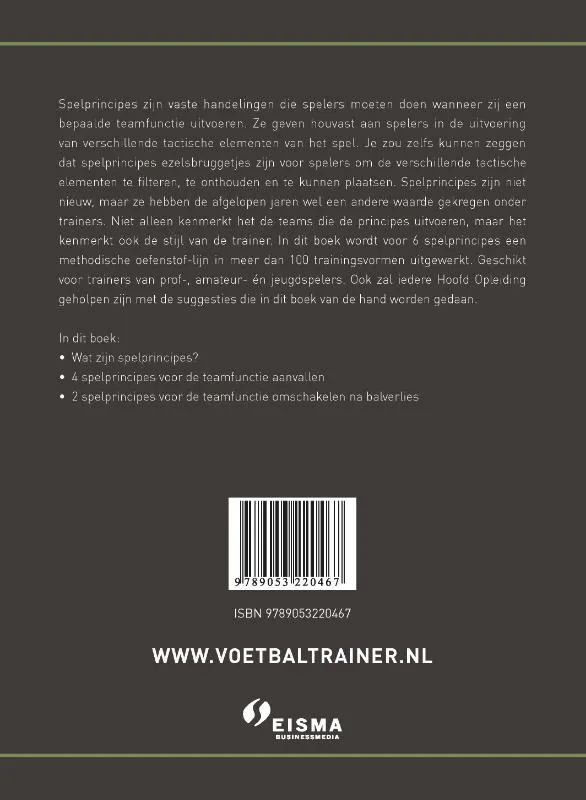 Spelprincipes zijn vaste handelingen die spelers moeten doen wanneer zij een bepaalde teamfunctie uitvoeren. Ze geven houvast aan spelers in de uitvoering van verschillende tactische elementen van het spel. Je zou zelfs kunnen zeggen dat spelprincipes ezelsbruggetjes zijn voor spelers om de verschillende tactische elementen te filteren, te onthouden en te kunnen plaatsen. Spelprincipes zijn niet nieuw, maar ze hebben de afgelopen jaren wel een andere waarde gekregen onder trainers. Niet alleen kenmerkt het de teams die de principes uitvoeren, maar het kenmerkt ook de stijl van de trainer. In dit boek wordt voor 6 spelprincipes een methodische oefenstof-lijn in meer dan 100 trainingsvormen uitgewerkt. Geschikt voor trainers van prof-, amateur- én jeugdspelers. Ook zal iedere Hoofd Opleiding geholpen zijn met de suggesties die in dit boek van de hand worden gedaan.
