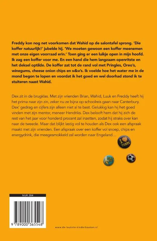 Dex zit in de brugklas. Met zijn vrienden Brian, Wahid, Luuk en Freddy heeft hij het prima naar zijn zin, zeker nu ze bijna op schoolreis gaan naar Engeland. Dex’ cijfers zijn nog niet om over naar huis te schrijven en zijn gedrag is ook voor verbetering vatbaar. Gelukkig kan Dex het goed vinden met zijn mentor, meneer Hendriks. Dex belooft hem dat hij zich de rest van het jaar voor 100% zal inzetten, zodat hij straks over kan naar de tweede. Maar dat blijkt lastig vol te houden als Dex ook een afspraak maakt met zijn vrienden. Een afspraak over een koffer vol snoep, energydrink en chips die meegesmokkeld zal worden naar Engeland. Dex wil zijn vrienden niet teleurstellen, maar meneer Hendriks ook niet. Wat stopt hij uiteindelijk in zijn koffer?