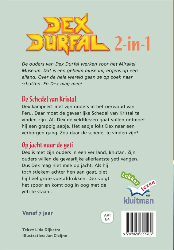 In ‘De schedel van kristal’ (deel 1 van de serie Dex Durfal) kampeert Dex samen met zijn ouders in het oerwoud van Peru, waar ze de Schedel van Kristal hopen te vinden. Die is heel gevaarlijk. Bij de rivier ontmoet Dex een aapje, dat hem naar een verborgen gang lokt. Wat is hier te vinden?
