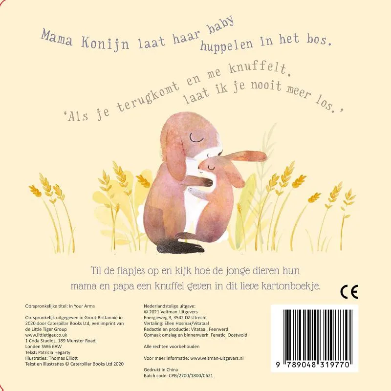 Mama Konijn laat haar baby huppelen in het bos. ‘Als je terugkomt en me knuffelt, laat ik je nooit meer los.’ Til de flapjes op en kijk hoe de jonge dieren hun mama en papa een knuffel geven in dit lieve kartonboekje.