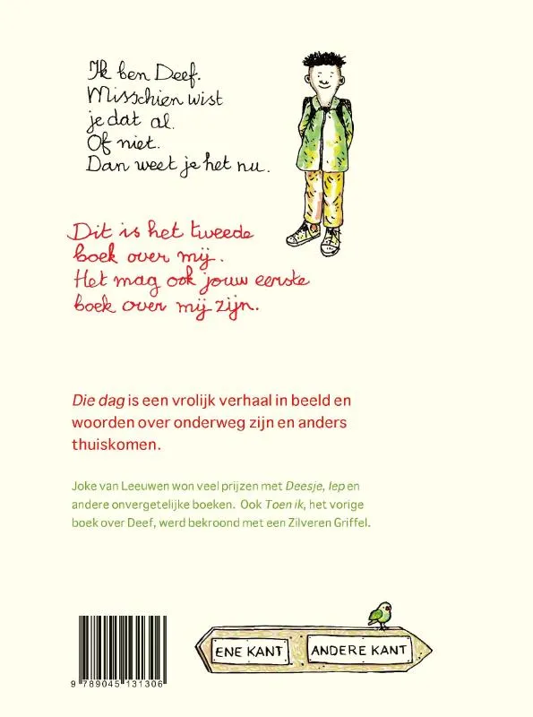 Deef vraagt aan iedereen de weg, maar die moet hij zelf vinden. Zijn gedachten verkennen al wandelend het hele fantasierijke universum dat we kennen van Joke van Leeuwen, met vragen over slakkenvorkjes, vingerhoeden en slimme mieren. Terwijl de school allang begonnen is…