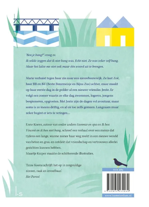 Marie verhuist tegen haar zin naar een nieuwbouwwijk. Ze laat Zoë, haar BB en BZ (Beste Buurmeisje en Bijna Zus) achter, maar maakt op haar eerste dag in de polder al een nieuwe vriendin: Jente. Er volgt een zomer waarin ze elke dag zwemmen, logeren, jongens bespioneren, opgroeien. Met Jente zijn de dagen vol avontuur, maar soms is ze ineens driftig, en af en toe zelfs gemeen. Naarmate de zomer vordert, begint er iets te wringen bij Marie. Moet je elkaar altijd kunnen vertrouwen, zoals ze Zoë vertrouwde, of kan vriendschap ook heel anders zijn?