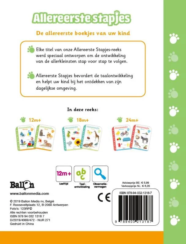 Elke titel van deze reeks werd speciaal ontworpen om de ontwikkeling van de allerkleinsten stap voor stap te volgen. ‘Allereerste Stapjes’ bevorderen de taalontwikkeling en helpen de peuter bij het ontdekken van zijn dagelijkse omgeving.
