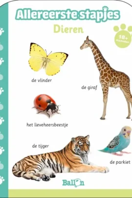 Hardkartonnen aanwijsprentenboekje met kleurenfoto’s van dieren, aangevuld met enkele vragen. Vanaf ca. 2 jaar.