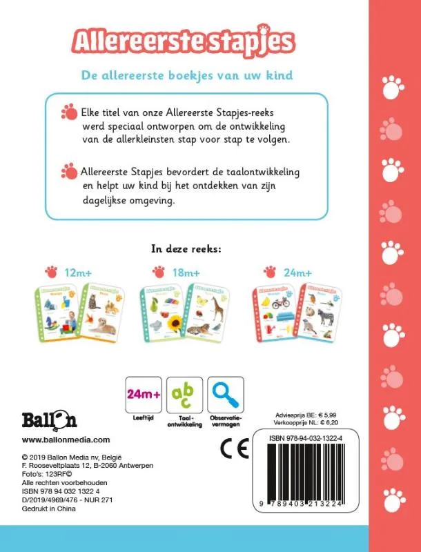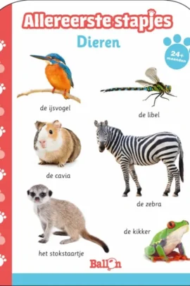 Hardkartonnen aanwijsprentenboekje met kleurenfoto’s van dieren, aangevuld met enkele vragen. Vanaf ca. 2,5 jaar.