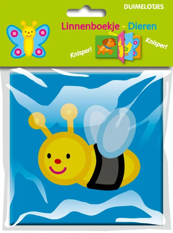 Stoffen babyboekje zonder tekst met een knisperelement in alle pagina’s. Met felgekleurde afbeeldingen van acht dieren, steeds op een wisselend gekleurde ondergrond. Met bevestigingsbandje met klittenband. Vanaf ca. 6 maanden.