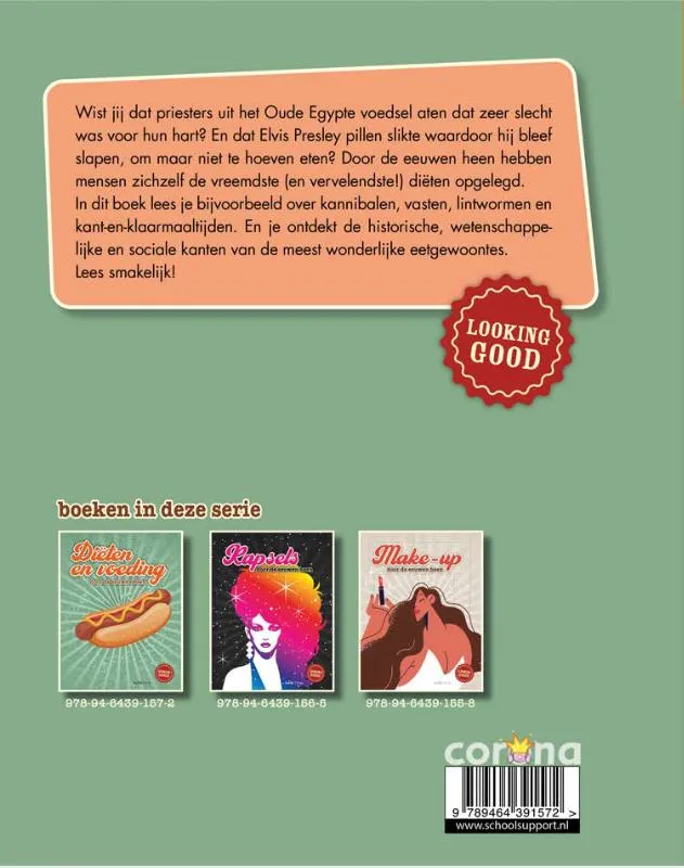 Informatief boek met rijke teksten en veel kleurrijk beeld over de geschiedenis van en variëteit aan diëten en voeding.