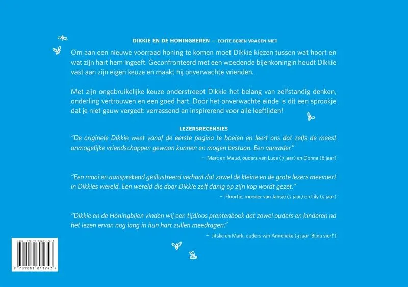 Dit voorleesboek neemt ouders en kinderen serieus in zowel tekst als tekening. Onze driejarige dochter wil het herhaaldelijk voorgelezen krijgen en is gefascineerd door de sleutelscène van het verhaal. Ook het liggende en grote formaat van het boek, met tekst op de ene pagina en illustraties op de andere pagina, is erg prettig. Zo kunnen de kinderen goed naar de prachtige tekeningen kijken, terwijl de tekst duidelijk en gemakkelijk leesbaar blijft. Dikkie en de Honingbijen vinden wij een tijdloos prentenboek dat zowel ouders en kinderen na het lezen ervan nog lang in hun hart zullen meedragen. (Jitske en Mark, ouders van Annelieke)
