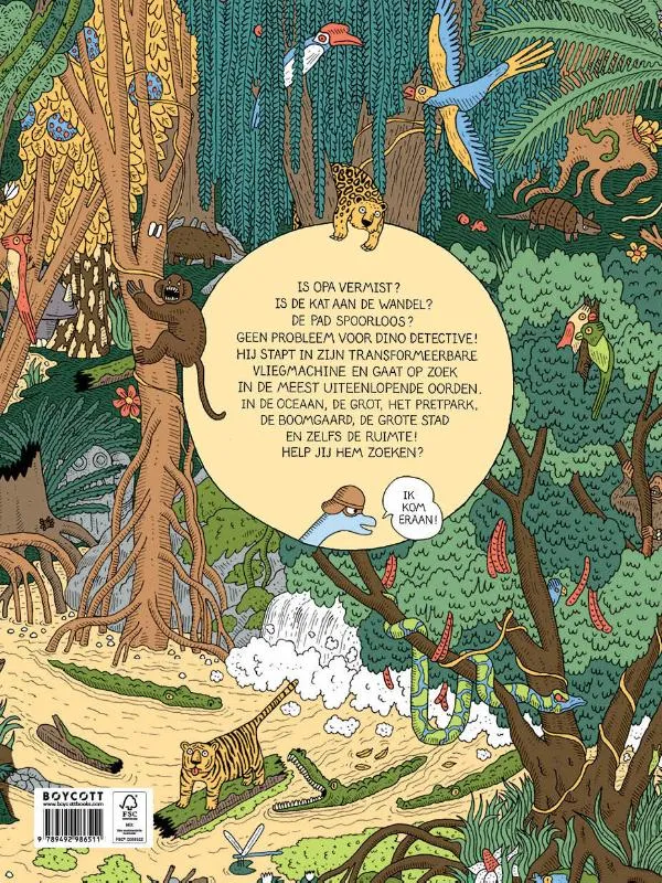 Spring aan boord van het rode vliegtuig van Dino Detective en reis de wereld rond, op zoek naar verloren dieren en mensen. Niets ontsnapt aan zijn oog dat zo scherp is als dat van een lynx: geen verloren kat in een dichtbebouwd middeleeuws dorp en geen opa in een labyrintisch museum… zeker niet als hij geholpen wordt door de lezer! Kun jij bijvoorbeeld de verloren blauwe pad van de prinses in de ondergrondse grot met duizend-en-een kamers vinden?