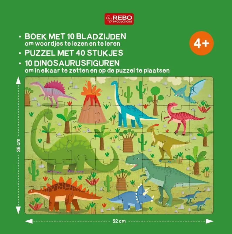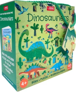 Box met een boek, puzzel en 10 dinosaurusfiguren voor kinderen om woordjes te leren.