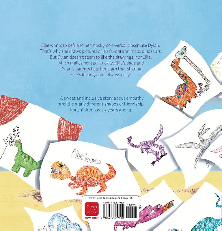 Ellie wants to befriend her mostly non-verbal classmate Dylan. That’s why she draws pictures of his favorite animals: dinosaurs. But Dylan doesn’t seem to like the drawings, nor Ellie, which makes Ellie sad. Luckily, Ellie’s dads and Dylan’s parents help her learn that sharing one’s feelings isn’t always easy. A sweet and inclusive story about empathy and the many different shapes of friendship. For children ages 5 years and up.