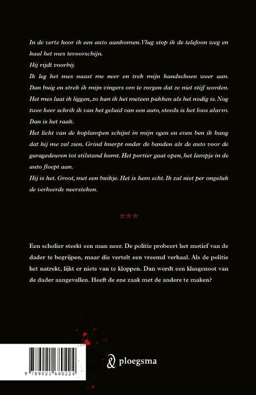 Ik herken de auto. Het licht van de koplampen schijnt in mijn ogen en even ben ik bang dat hij me zal zien. Grind knerpt onder de banden als de auto voor de garagedeuren tot stilstand komt. Het portier gaat open, het lampje in de auto floept aan. <br>