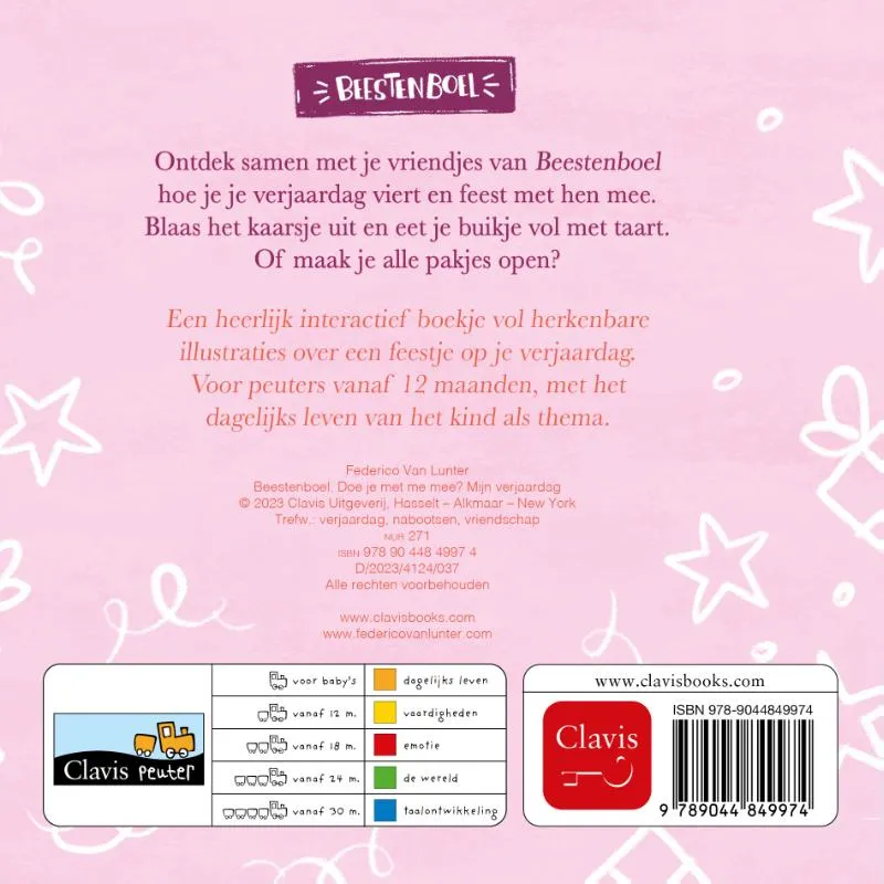 Een heerlijk interactief boekje vol herkenbare illustraties over een feestje op je verjaardag. Voor peuters vanaf 12 maanden, met het dagelijks leven van het kind als thema.