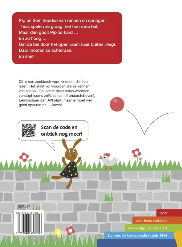 In dit zoekboek over de sportieve tweeling Pip en Sem zijn woorden verstopt. Heel veel woorden. Het zijn de woorden die kinderen leren op school: kim, ik , maan, vis, roos, en nog veel meer. Je blijft kijken in dit verhaal, waarin Pip en Sem een rode bal achterna gaan die steeds verder stuitert. In de illustraties zijn allerlei zoekwoorden verstopt. Deze woorden zijn eenvoudiger dan AVI start, maar je moet wel goed speuren. En lezen. Dat maakt dit boek leuk én uitdagend.