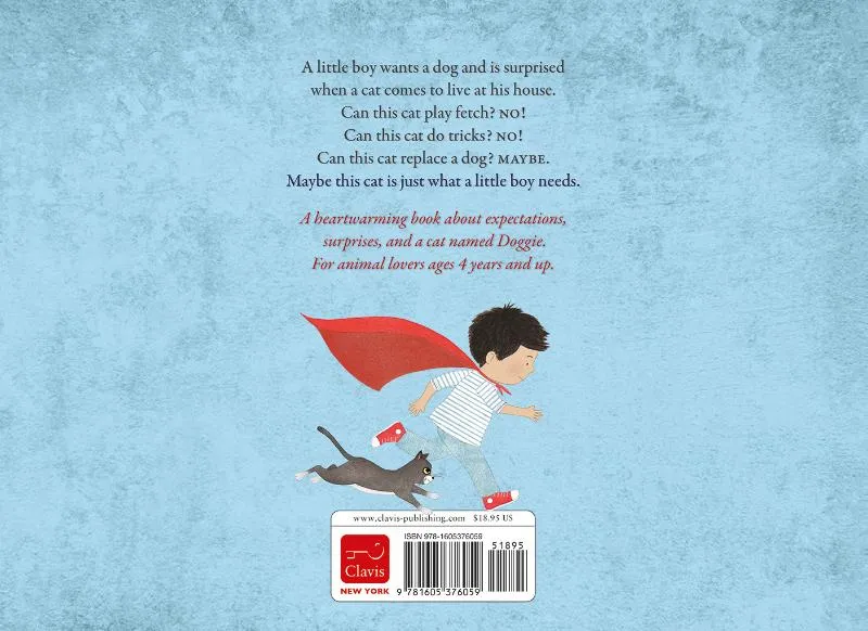 Een jongetje wil dolgraag een hond, maar dat wil zijn moeder niet. Als op een regenachtige dag een kat komt aanlopen, mag die blijven. Het jongetje noemt de kat Doggie en probeert haar hondendingen te leren. Want katten zijn toch helemaal niet leuk? Oblong prentenboek met grappige, zachtgekleurde tekeningen. Vanaf ca. 4 jaar.