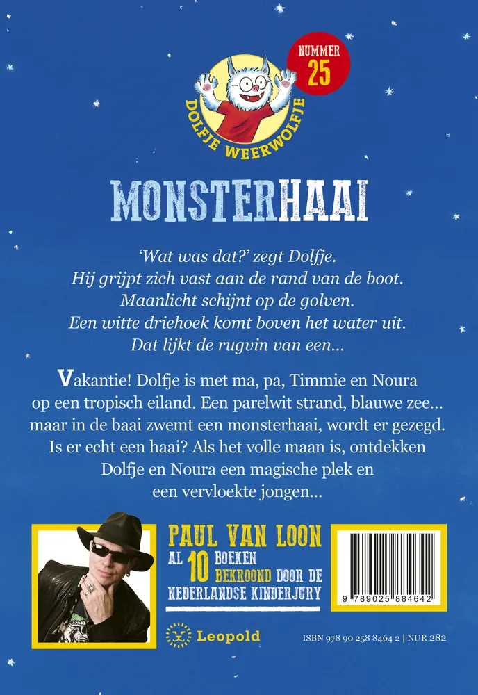 Vakantie! Dolfje is met ma, pa, Timmie en Noura op een tropisch eiland. Een parelwit strand, blauwe zee… maar in de baai zwemt een monsterhaai, wordt er gezegd.