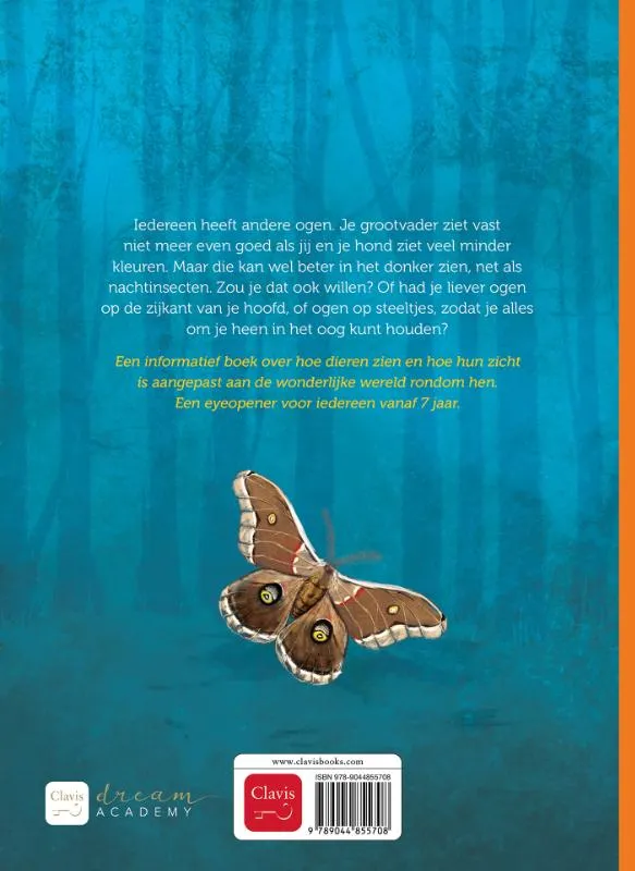 In het begin waren er geen ogen. Maar toen er op aarde meer diersoorten kwamen, en je moest vechten voor voedsel en ruimte, was het natuurlijk wel handig als je rondom je kon kijken. Zo kregen levende wezens ogen … Alle dieren hebben trouwens andere ogen. Bij ons mensen zitten ze vooraan in ons hoofd, zodat we goed kunnen focussen. Een geit heeft ogen aan de zijkant van de kop; zo kan hij perfect links en rechts kijken of er geen roofdier aankomt. En wist je dat er in de donkere diepzee zelfs soorten leven die licht kunnen maken om beter te kunnen zien, als een soort nachtlampje? Een boek vol interessante weetjes dat je inwijdt in de wonderlijke wereld van het zien. Voor kinderen vanaf 7 jaar.